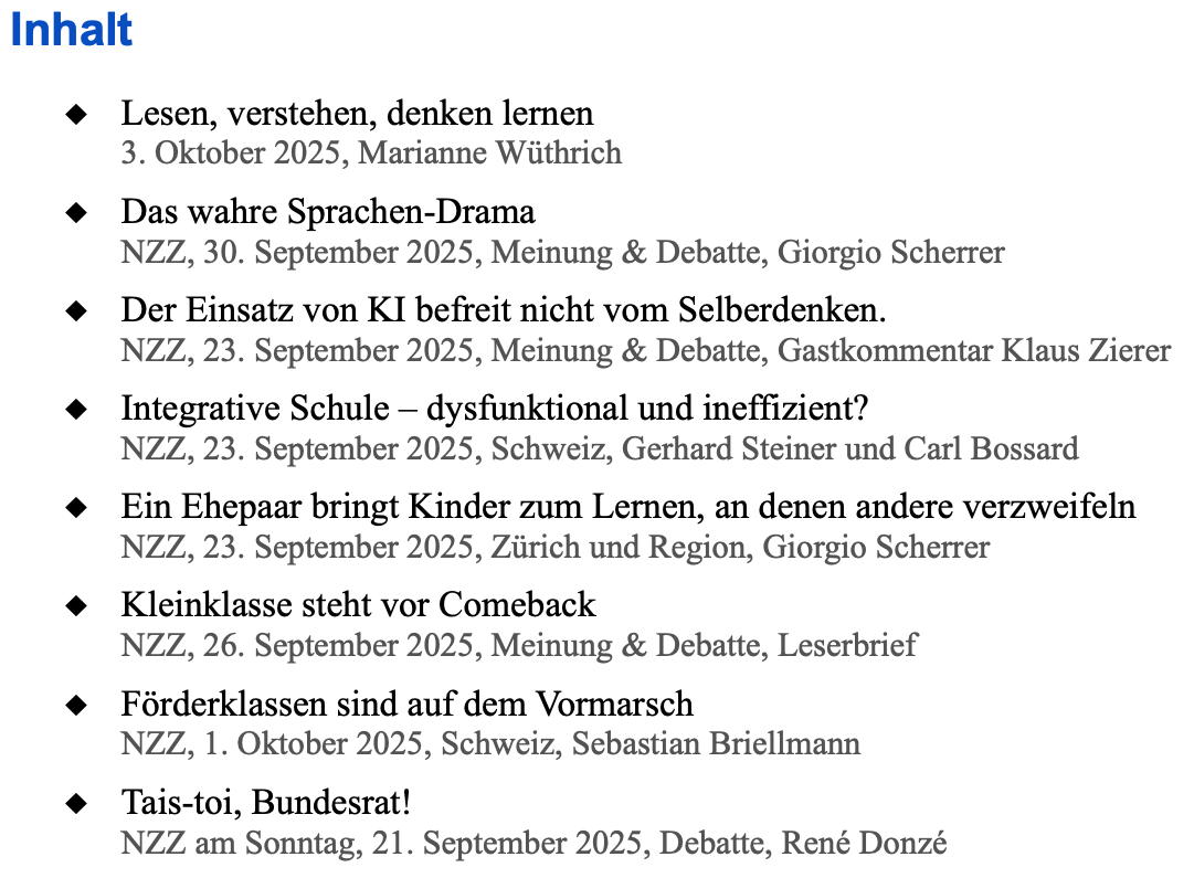 Ein brandneuer Bildungsartikel in der NZZ erinnert daran, dass das grösste Problem der Schweizer Volksschule nicht die Fremdsprachen sind, sondern die mangelhaften Deutschkenntnisse eines erheblichen Teils unserer Jugend. Der Leserschaft unseres Newsletters ist die sinkende Lesefähigkeit unserer Kinder und Jugendlichen seit Jahren bekannt – gut, dass die NZZ diesen Fakt und seine Folgen mit dem nötigen Ernst aufgreift. Redaktor Giorgio Scherrer benennt die schwerwiegenden Auswirkungen des Lesenotstands: auf den einzelnen Menschen, aber auch auf die Erhaltung und Weiterentwicklung unserer Kultur sowie auf den gesellschaftlichen Zusammenhalt.
