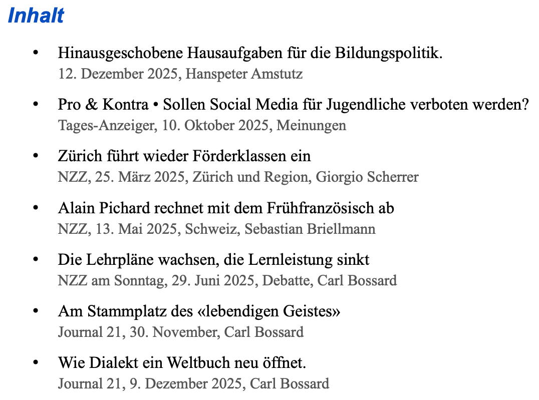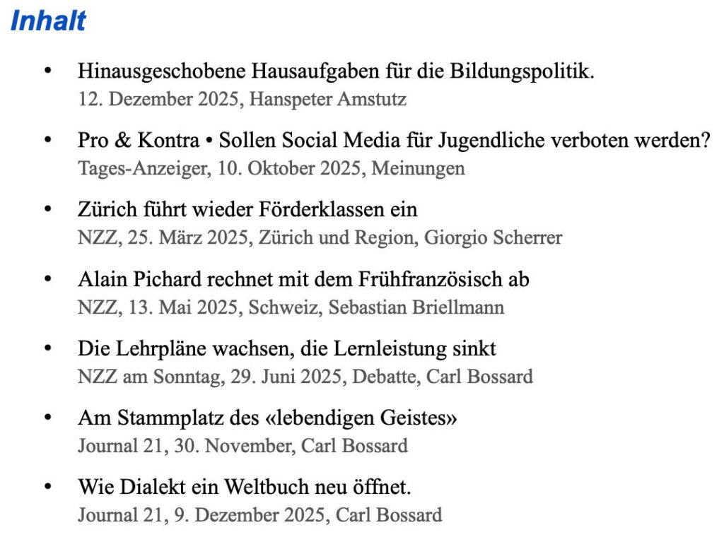 Erwähnenswert in einem Jahresrückblick ist zweifellos auch die Tatsache, dass Handyverbote an vielen Schulen mit grosser Zustimmung der Eltern eingeführt wurden. Offen bleibt, was im kommenden Jahr im Bereich der Sozialen Medien geschieht. Deren Schadenspotenzial für die Jugend ist nicht zu übersehen. Australien hat kürzlich mit dem Verbot der Benützung von Sozialen Medien für unter 16-Jährige eine weltweite Diskussion ausgelöst. Man darf gespannt sein, welche Lösung in der EU und in der Schweiz auf diese neue erzieherische Herausforderung gefunden wird.