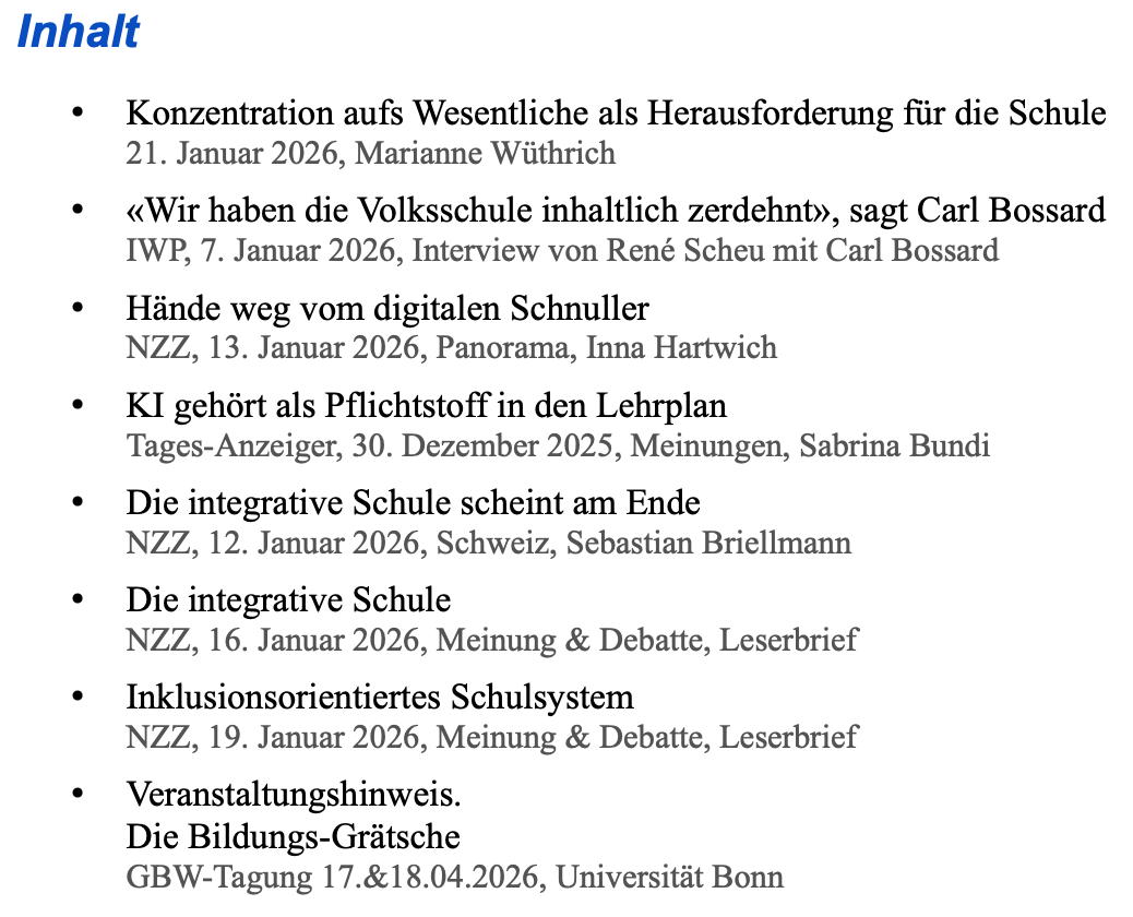 Wir begrüssen alle Leserinnen und Leser zum Neuen Jahr 2026 und freuen uns auf den weiteren Austausch mit Ihnen, gerne als Echo auf unseren Newsletter oder vielleicht auch persönlich an einem der nächsten Vortrags- und Diskussionsabende des Vereins Starke Volksschule Zürich.