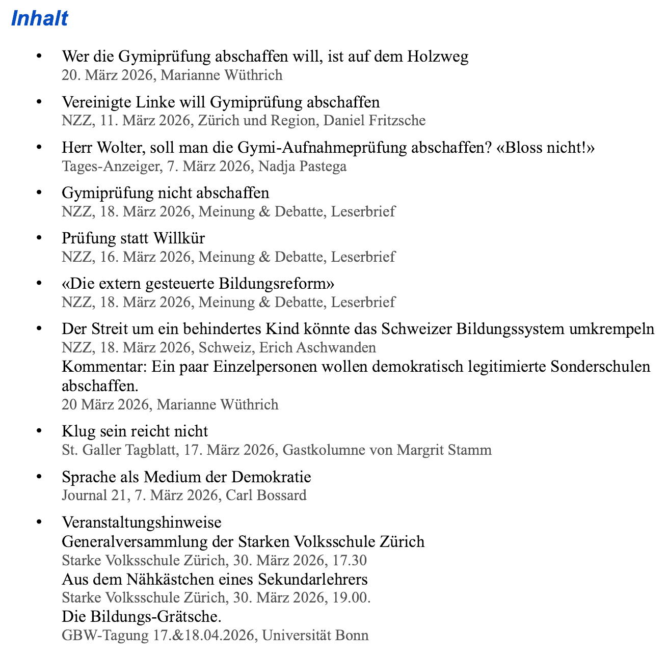 Bekanntlich wollen viele Eltern ihre Kinder nach der sechsten Klasse ins Gymi schicken, weil die Qualität der Oberstufe der Volksschule vielerorts zu wünschen übrig lässt. Wenn jedes Kind – mit oft unrealistischen Vornoten – ohne Prüfung ins Gymi zugelassen wird, würde das Image der einst allseits geschätzten Sekundarstufe auf eine zweitrangige Schule sinken. Das ist nicht recht, gibt es doch auch viele leistungsstarke und lernwillige Jugendliche, die lieber eine Berufslehre machen wollen. Ihnen und ihren Mitschülern müsste die Oberstufe eine Top-Bildung als Voraussetzung für einen guten Berufseinstieg bieten, was leider heute oft nicht der Fall ist. Hier gilt es anzusetzen: Die Sek muss wieder zu einer guten Schule werden, auch ausserhalb der Gymi-Vorbereitung.