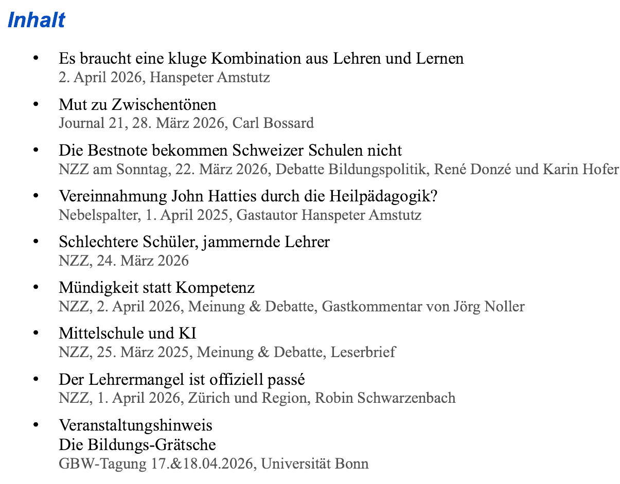 Zur Information unserer Leserschaft haben wir einen NZZ-Bericht zu Hatties Zürcher Schulbesuch und einen Text mit einer Gegenüberstellung seiner jüngsten Aussagen zu seinen eigenen Forschungsergebnissen in unseren Newsletter aufgenommen.