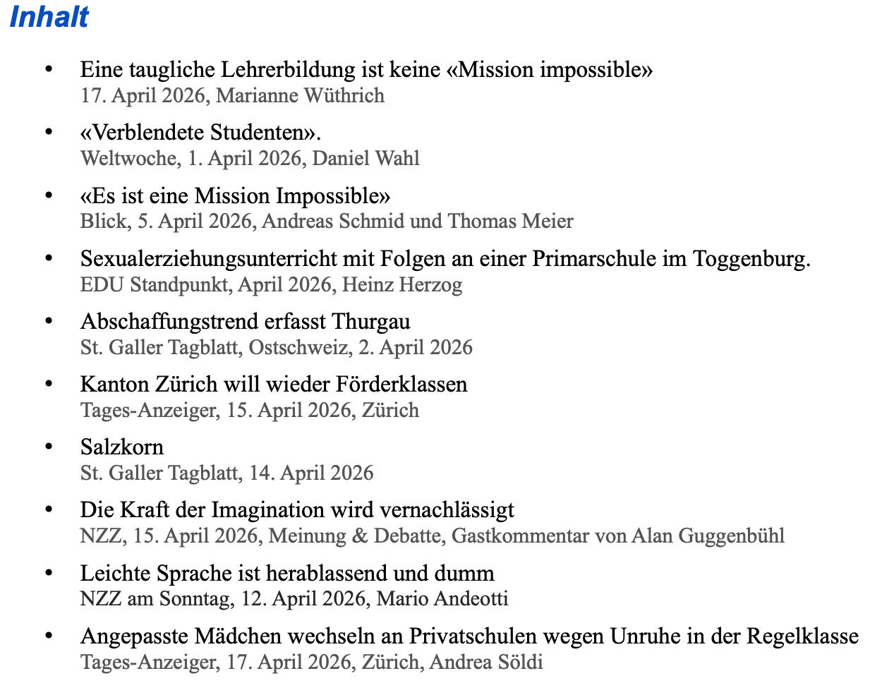 Einige der von Res Schmid thematisierten Probleme der Volksschule, die auch in unserem Newsletter immer wieder aufgegriffen werden, kommen heute erfreulicherweise in verschiedenen kantonalen Parlamenten an. Der Thurgauer Kantonsrat hat anfangs April in einem zweiten Anlauf (nach neun Jahren) beschlossen, den Französischunterricht auf die Oberstufe zu verschieben, mit der Bemerkung eines Motionärs: «Der Zusammenhalt der Schweiz hängt nicht an vier Lektionen Frühfranzösisch in der Mittelstufe, die Willensnation gab es auch schon vor dem Frühfranzösisch.»